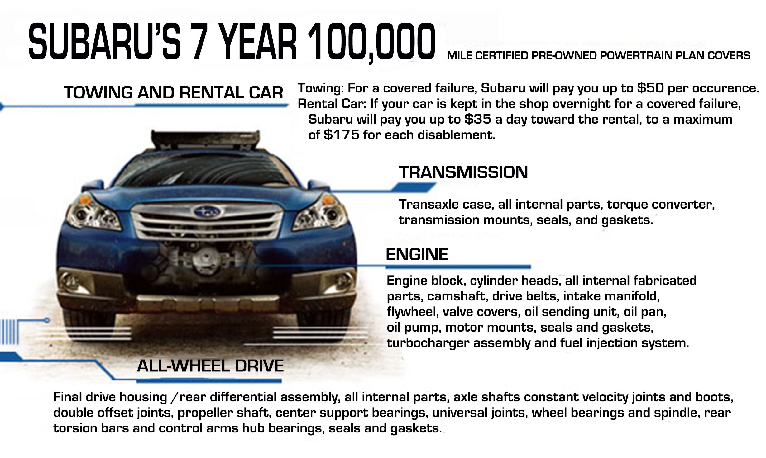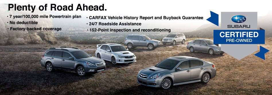 - All Subaru Certified Pre-Owned vehicles come standard with a nationally accepted and recognized, seven year, 100,000 Mile Power-train Warranty that is backed by Subaru.